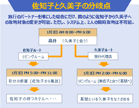 彼女を攻略しようとするなら、3日と4日は他の女のコに時間はさけないと思うべし。また、右上の「佐知子と久美子の分岐点」チャートを見ても判るように、