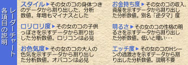 左部分は、各女のコの6つの魅力(項目)を5段階で評価したレーダーチャート。右部分は、その評価の基となった、ゲーム中で知ることが出来る女のコのデータ。下部分は、そのデータから分析した”オススメの人”。