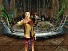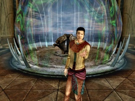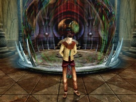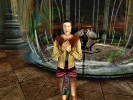 バブルペデスタルから出てみると、背後に突然女性が出現します。彼女はイーシャ。アトラスとキャサリンの娘です。彼女は、D'ni人なので約200歳ぐらいになるのでしょうか?!その顔には「傷」のような跡があり、彼女の人生の凄まじいほどの困難さを物語っていたのです。(顔の傷のように見えるのは実はルーン文字かも知れません!?)
