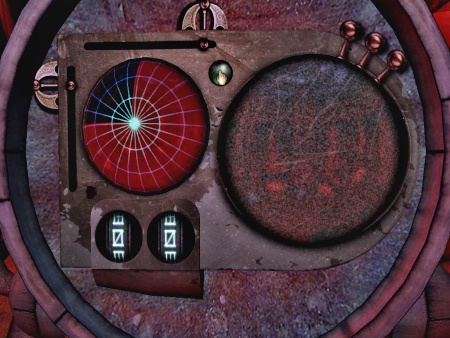 一度コントロール・ルームに戻ってきます。コントロール・パネルであの障害物を除けないといけません。各パネルを観察してみると、ひとつだけ向かって右の後ろにあるパネルだけがノイズを発生していてパネルビューも砂嵐状態です。このパネルを操作して見ることにします。パネルには左に上下スライダー、上に左右スライダー、中央にボタン、右に3つのズームセレクトボタンがあります。そしてパネルには2つのマップビューと2つのD'niの数字がスライドするウインドウがあります。そのD'niの数字のスライドウインドウは上下スライダーと左右スライダーによってスライドします。D'niの数字スライドウインドウをスライドしていくと、一つだけD'niの数字ではないものがあります。とりあえずそのマークを中央に来るように各スライダーを調節してから、中央の緑色に点滅しているボタンをクリックすると機械音がします。