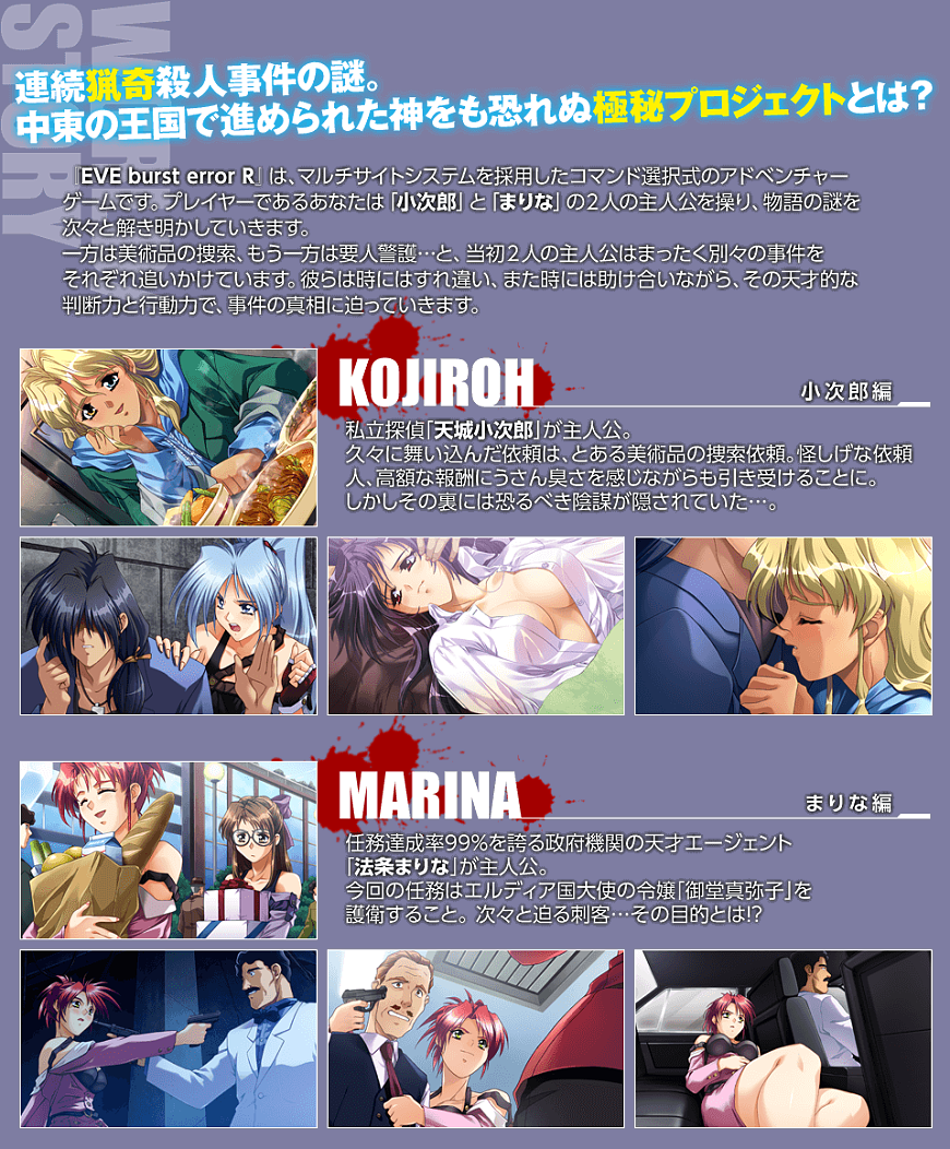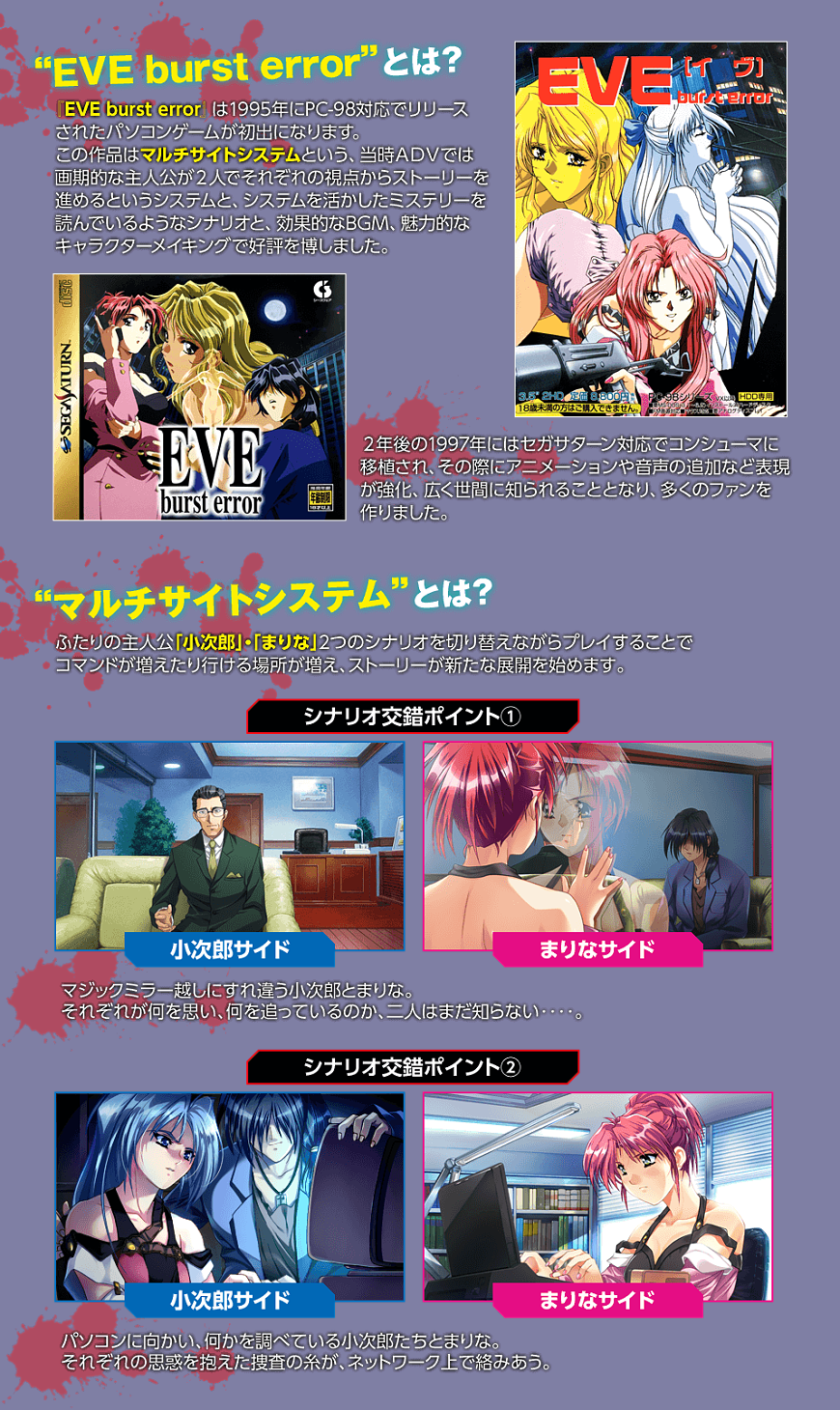 「EVE」のストーリーは、2人の主人公がそれぞれの視点でゲームを進める"マルチサイトシルテム"という方式で展開される。 1人の主人公が行き詰った場合は、別の主人公のストーリーを進める事で行き詰まりが解消され、再びゲームが進展していく。主人公を切り替える