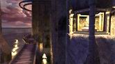 アマテリアでは、水の上に建設されている小さな木製のパゴダ(仏塔)に到着します。右にはアマテリアを象徴するように中央タワーがそびえていて、トラックがこちらに向かって伸びています。空には雷雲があって、不気味な雰囲気です。振り向いて下を見ると光を放つ岩があって、また、下に降りるためのハシゴも用意されています。ですが、とりあえずは木製の橋を渡って前方に見える塔に向かいましょう。