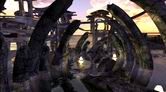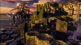 共鳴リングのパズルがクリアできたら、とりあえずサーヴェドロの洞窟を目指します。次のパズルの回転式トラックは、共鳴リングの装置の近くにあるのです。サーヴェドロの洞窟を抜けて共鳴リングの分岐点まで進んだら、5番目のリングに向かいます。5番目のリングを通り抜けて、トラックの上を進んでいくと、行き止まりになります。ここで左を向くとコケで覆われた六角形の岩があります。