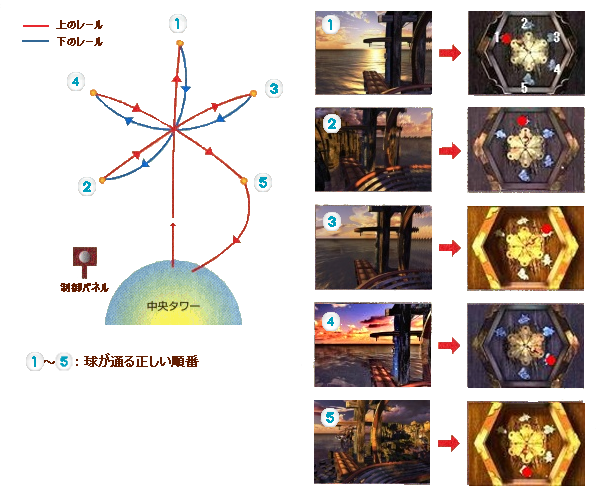 ここからは少し複雑になります。トラック上まで進んだら、左を向いてトラックが5つに分岐している場まで移動します。先ほどの制御パネルで調べた、ボタンと水晶の関係を思い出してください。とりあえず、分岐を曲がらずにまっすぐに進んでリングに近づきましょう。水晶が設置されている柱にはダイアルがあります。このダイアルは制御パネルのボタン(=氷の球が通る順番)と連動しています。つまり水晶の光が消えた順番は、このダイアルによって制御されているのです。柱に近づいてからダイアルにカーソルを合わせてクリックすると、ダイアルを操作出来るようになります。この位置のリングは最初に通過するものなので、1番に設定しておきましょう。同様に、残りの4つのリングも先ほど調べた順番で変更していけばよいのです。各共鳴リングを通過する順番は、中央タワーから見て12時方向、8時方向、2時方向、10時方向、4時方向になります。これに従って、各共鳴リングのダイアルを設定しましょう
