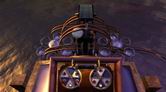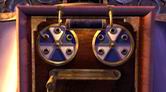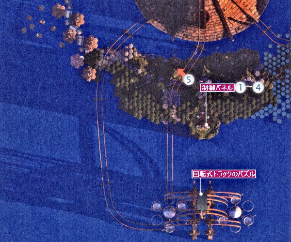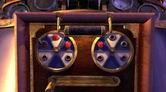 制御パネルには、3個の赤い栓と横にスライドするレバーが1本あります。パネルの上部には回転するダイアルが2つあって、それぞれ5つの穴が空いています。このパズルはもともと簡単にクリアできるように設計されていて、解答が複数存在していました。しかしサーヴェドロによって穴が塞がれ、解答は1つのみとなってしまったのです。ここでの目的は、制御パネルでホイールの回転とバネの動きを赤い栓で適切に設定して、中央タワーから発射された氷の球がホイール間を往復出来るようにすることです。氷の球が右側ホイールの左上方にあるリングに入って、中央タワーへと戻ればクリアなのです。赤い栓の置く場所は→左の回転盤の12時方向と2時方向。右の10時方向の位置に置けばよいのです。