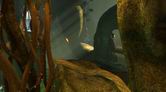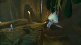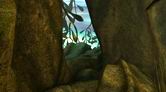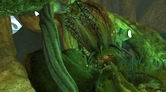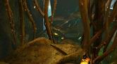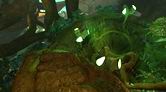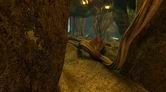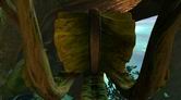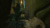 螺旋状に下っている通路をさらに進んで行くと、巻かれている舌シダがあります。ここで3回目となる舌シダですが、ほかの場所のとは少し雰囲気が異なります。この舌シダにはランタンのような胞子が近くになく、また光がほかの葉や木々に遮(さえぎ)られてしまっているのです。この先は行き止まりになっているので、通路をサーヴェドロの壁画まで引き返しましょう。