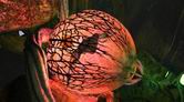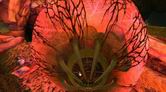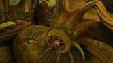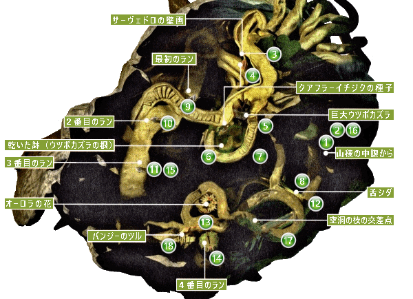 階段を下りていくと、緑色のライトによって照らし出された場所に出ます。ここにはイチジクのしぼんだ種子のほかに、螺旋状植物の花びらのような鉢があります。またこの鉢に、巨大ウツボカズラの根が巻きついていることをチェックしておきましょう。