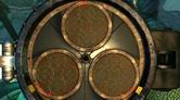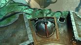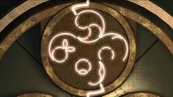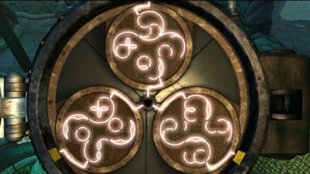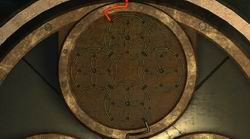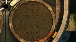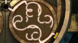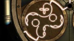 内側のシールドのコンソールに電源が供給できたら、左側に移動してコンソールをクリックして引き上げて、カバーを開きます。コンソールパネルのある3つの円は、それぞれシンボルを表してします。各シンボルは4つの部分からなり、タペストリーで見たものと似ています。またアトラスがアマテリア、エダーナ、ヴォルタイクの3つの時代に隠した各シンボルにも、タペストリーの図柄が用いられています。しかし各時代のシンボルはサーヴェドロによって削り取られていて、完全ではありません。