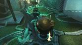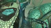 下の階の窓の隣にあった小さな氷のシールドには、もう1つ巨大なものがありました。ナラヤンの接続部屋の全体を氷がすっぽりと覆っているのです。ここからはうねるような生物のスケールも明確になります。ガスが充満した緑の胞子の上に、格子状の太い根が絡みついています。根はほぼ均等に配置されていて、何らかの意図が働いているようです。サーヴェドロの日記やホログラムのメッセージに出てきた「ラチスの木」なのでしょう。屋根の向こう側には、高い金属の塔が立っていて、その頂上には水晶が輝いています。右下には氷のシールドを通じて延びるケーブルに滑走船が吊るされています。左には、電気コイルが2列に配置されて、地熱から得た電気エネルギーが、丸い鉄格子のプラットフォームの上でオレンジ色に輝いています。