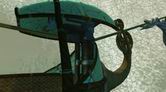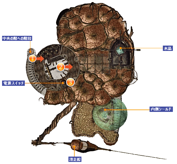 プラットフォームにある階段を使って、ナラヤンの地階に向かいます。その前に、プラットフォームにある滑走船を見ていきましょう。滑走船は、上部にあるケーブルにぶら下がる格好で、各支柱を移動します。滑走船自体は、ヴォルタイクで乗った気球と同じものです。現在は、外側のシールドのせいで、滑走船を動かすことが出来ません。