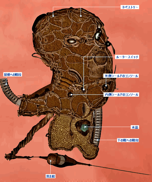 ナラヤンは水の世界。この不安定な世界で生きながらえるために、ナラヤンに芽吹いた文明は固有の生態系を発展させています。ジェナーニンから接続書を使ってナラヤンを訪れると、床や壁が生物の一部のような部屋に到着します。半透明の壁には黒っぽいツルのようなものが巻きついていて、柱と階段には太い根が絡みついています。根は床だけでなく天井まで広がって、頑丈な十字の梁を形作っているのです。背後の壁には、5枚の赤いタペストリーがかかっていて、文明があることを証明しています。どのタペストリーにも単語とシンボルが刺繍されています。壁にはもう1枚のタペストリーが引き剥がされたような跡があります。