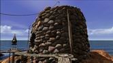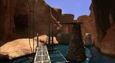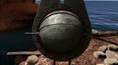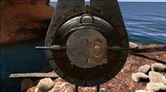 ヴォルタイクでの冒険は、小さな島にかかる金属性のキャットウォークから始まります。島は、メインの島の峡谷に通じる入り江にあります。キャットウォークは、小さな島にある石の建造物とメインの島を繋いでいて、崖の壁を通ってクレパスの中に延びています。キャットウォークを正面に進むと、小さな島の石の建物のドアの前に辿りつきます。ドアをクリックして開こうとしても、何も起こりません。ドアのハンドルに付属しているロックのメカニズムが電力を必要としているらしいのですが、ここには電気がきていなくて、ドアが開けられないようです。島の左側には、金属製の容器が見えます。ウィング付きのバスケットボールのような容器で、中には、ジェナーニンに戻るための接続書が入っています。