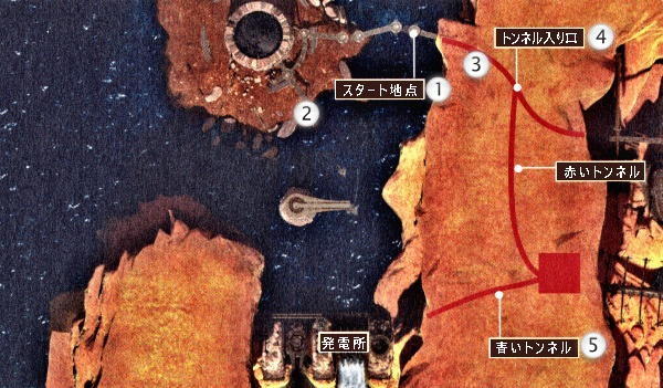 右に曲がってトンネルの中に入りましょう。中は薄暗くオレンジ色の照明に照らされています。途中、サーヴェドロの日記の一部が落ちていますので、忘れずに拾っておきましょう。そのまま左に曲がっていく道に沿って、次の分岐点まで進んで行きましょう。