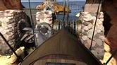飛行船は鉄塔に沿って、曲がりくねったヴォルタイクの地溝を進んで行きます。地溝のコーナーを曲がると、前方に発電所の水車が回っています。水車の上を悠々と飛行して、入り江に沿って進みます。そして、最初の鉄塔にぶつかって停止します。