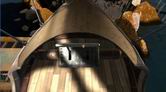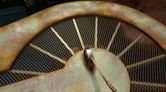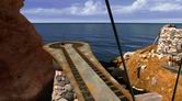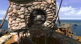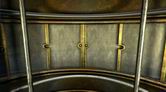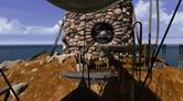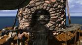 飛行船はゆっくりと進み、小さな島に到着します。正面の岩の建物のドアは緑に輝き、電気が流れていることを示しています。ドアのロックをクリックして中に入ると、小さな石の部屋が現れます。ハシゴ付きの長いシャフトが下に向かって延びています。この長いハシゴを降りて、シャフトの一番下まで行きましょう。そこで床のホイールをクリックします。
