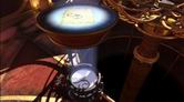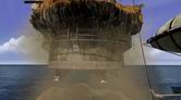 ポールが正しい位置にくると、鉄塔と鉄塔がつながって、小さな島へ電力が供給されます。この接続が完了すると、回路を通じて小さな島へ電気が流れます。周囲を見渡すと、島が地面から離れていくのがわかります。島が空中に浮揚しているのです。この浮揚は磁石の力によって引き起こされています。島の下はあの電磁チェンバーなので、島と電磁チェンバーにある2つの強力な電磁石が相互に反発して、浮揚力となっています。岩の破片やゴミもこの力によって、島と地面との間に渦巻状に浮遊しています。飛行船の中に戻り、リリースハンドルを引きます。飛行船は空中浮揚している島に向かって飛びます。