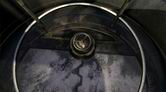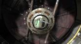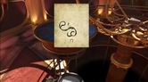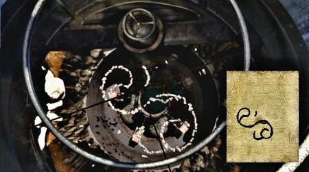 床のホイールをまわすと、金属の床が開いて、下のほうに電磁チェンバーが見えます。島と地面の間では、ゴミや破片が1つのシンボルを形づくっています。ジェナーニンに持ってかえらなければならないエネルギーのシンボルです。シンボルは自動的に空白のページに記録されて、イベントリー(画面下)に入ります。