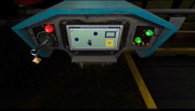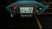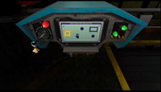 左斜め前方に操縦席があります。下へ視点を移動すると、青いマークがある水色のパネルの左に、鍵のようなものが刺さっていて回せるようです。