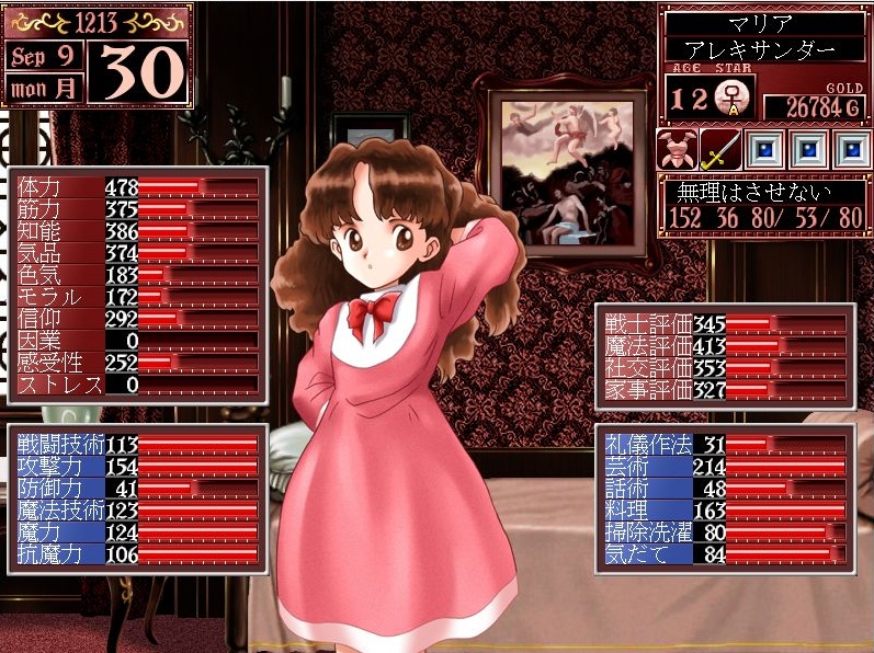 お金が貯まったら、しばらく学習・訓練をさせるというパターンで過ごしていくといいだろう。剣術や格闘術などの訓練をさせて、 武者修行に出しても無事帰ってくる(戦士評価がおよそ250くらい)ようになればお金が増えても学習・訓練も集中的に出来るようになるはずだ。 そうなれば能力も飛躍的に上がり、毎月武者修行に出して、一気にお金を貯めてしまうという方針もとれる。希望の職業に就くための能力の調整は、 年齢が上ってきてからでも間に合うので3年くらいは基礎能力づくり中心のスケジュールを組むようにしよう。