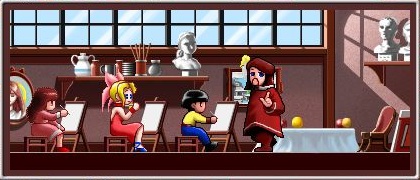 王宮絵師は、高貴な人々の肖像画を何枚描いていくらの商売。最近は経費節減のため注文が少ないので、街で絵画教室を開いている。 通ってくるのは、良家の子女たち。財産家の娘で社交界の華を目指しているパトレイシア・ハーン嬢も見える。