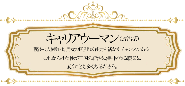 王国の統治に関わる職業(官吏・文官職)の中で、娘が就くことの出来るものは次のとおり。