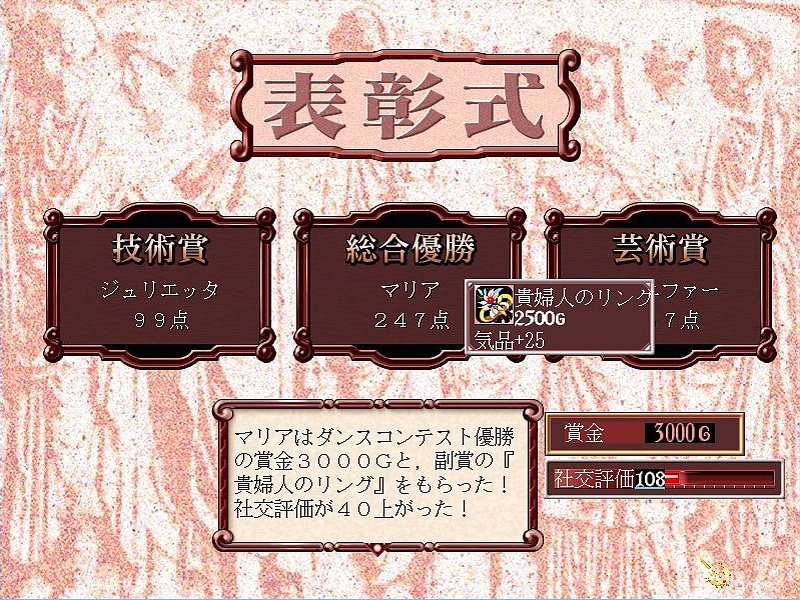 年に一度の国を挙げてのイベント『収穫祭』。娘にとっても日頃の修練を活かす絶好のチャンス。 そして競技会で優勝すれば、娘の評価はますます上がるし、高額の優勝賞金だって入ってくる。おまけに賞品(アイテム) だってもらえるのだ。習い事にはお金がかかる。それを1年目で優勝して得られた賞金やアイテムを利用し、 娘の評価や能力を上げる事が出来れば、プリンセスになるのも「夢」で終わらせずに済むのだ。