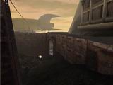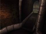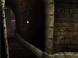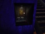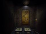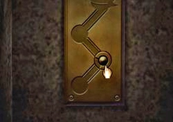 「ライムの書」の最後のページのイラストは桟橋の地下室にあった「イメージャー」です。イメージャーまで行き、計器パネルに「40」と入力してボタンを押します。イメージャーのスイッチを入れて、ミスト島の映像が出たら装置の裏側に行きます。裏側にも同様のスイッチがありますが、こちらは点滅しています。このスイッチを押すと映像が消えて、先ほどの計器パネルのハッチが開くのが見えます。計器パネルの所に行って観ると、計器パネルは下に収納されて、プレートが出現しています。そのプレートをよく観ると通路のような図が描かれていて、中央には「パックマン」のようなものがあり、そこをクリックすると「C」というのが左右が逆に動きます。そして何かが動く音がします。地下室を出てスペースシップの通路に向かいます。