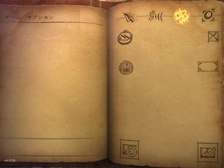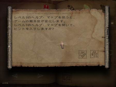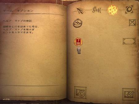 ヒント集に行くにはゲームのメインメニューにあるゲームの読み込みから一度ゲームを読み込んで、[escキー」でメインメニューに戻り、「オプション」→「ゲームオプション」→右のページにある上から二つ目のアイコンにマウスカーソルを持っていくと左側のページに「ヘルプマップ」と言う文字が表示されるので、そのままアイコンをクリックします。