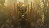 まず、カモダイルの足跡が向いている方向に進みます。行き止まりまで進みますが途中、右手の奥のほうに難破船の近くにあったものと同じトーテムポールがあり、遊んでいるマングリーたちを目撃出来ます。また木の上から降りてきてプレイヤーを見てすぐに逃げていくマングリーに行き会います。この時、またあの警告音を発しながら逃げて行きます。