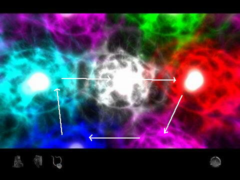 上の矢印のようにマウスカーソルを動かしていきます。中心にある「白いイーシャカラー(魂)」とは違う他の色(魂)はぐるぐるとイーシャカラーの周りを回るように動いているので、2周目は最初の1周目と同じようにイーシャカラーから右に移動しても最初の「赤」だった所には行かないかも知れませんが、コツがつかめるまでは気にせずに矢印のように動かして見てください。イーシャの魂は触れても変化はしないので、すぐに判ります。
