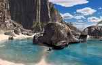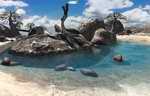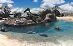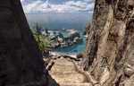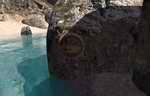 丁字路から石壁に挟まれた長い階段を進んでいくと、入り江が見え、その上に2匹のサナーがいます。この時サナーの形と泣き声をチェックしておきましょう。また一歩進むごとにサナーが落ち着くのを待っていると逃げられずに観察できます。階段を降りて入り江に入って、サナーがいた岩の後には3つ目の木の玉が隠されています。この玉の数字は「5」、音は「ワーク」です。