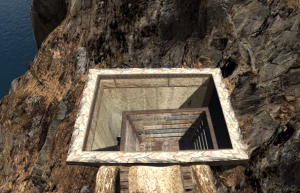 扉のところまで戻ったら、その向かいにある道を進みます。目的は斧が刺さっている場所です。そこには下へ降りる梯子がかかっていて、下部にはトロッコが止まっています。トロッコに乗ったら左手にあるレバーを操作しましょう。するとトロッコは次のCrater Islandへ向けて走り出します。
