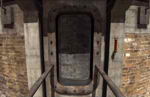 巨大ボイラーの正面に立つと、扉の右側に赤いゲートが見えます。これは内部の気圧の高さを表していて、水力装置を操作しただけでは、巨大ボイラー内部の圧力が高いので扉は開かない事を示しています。とりあえず階段を降り、巨大ボイラーの側面に回ってみると内部の状態が覗ける窓があります。 すると内部は圧力どころか水も貯まっていて、よく見ると床も低い位置にあります。巨大ボイラー内部に入るには、周辺のレバー類を操作して、水を抜き、床を上げておかなくてはなりません。そのためにまずは左の奥へ進み、先が二段のパイプのスイッチを手前に引いて接続方向を巨大ボイラーへ向けておきましょう。