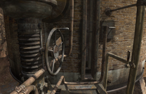 二段のパイプのスイッチを操作したら、巨大ボイラーの側面についている装置の方向を向き、右側コックを上に上げて炎を止めます。次に床を上げるため、右のレバーを上にあげます。そして左車輪を回して、内部の排水を行うための空気孔を作っておきましょう。またここの操作は窓枠内を視界に入れたままで出来るので、それぞれの操作を確認しながら行いましょう。
