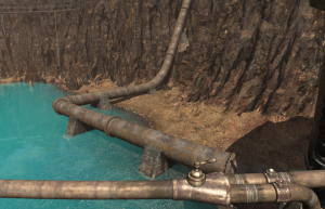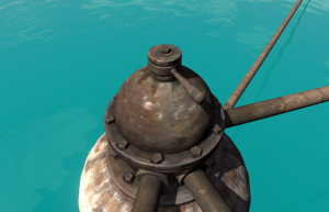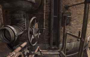 巨大ボイラー側面のレバー操作が終わったら、再び左を向きます。そして先ほどの二段のパイプのスイッチを奥へ変え、巨大ボイラー内部の水を放出するための排水を行います。以上の操作で巨大ボイラーの扉が開くはずです。ただし、これまでの手順を1つでも誤ると扉は閉まったままです。できれば湖の中央にきた時点でセーブしておいて、操作を誤ったらロードしなおすようにしておくと楽です。 さて扉の前に戻ると、赤かったゲージも透明になっていて、内部の気圧が元通りになっている事を示しています。そして階段を上がり扉の前に立つと自動的に開き、内部へと進めます。巨大ボイラーの中を見渡しても内部にはめぼしいものはなく、中央に梯子があるだけです。他に行けるところはありませんが、もう1つだけやることがあるので湖に引き返しましょう。