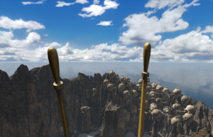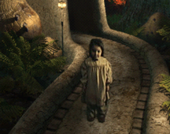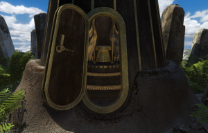 ゲーンの王座の操作は左レバーで王座を上昇させて、右レバーを倒します。すると眼科の処刑台の床が閉まるのが見えます。これでOK!王座を降ろし処刑台の方へ向かうためエレベーターまで戻ります。 そして魚のオブジェで降りて、村に向かおうとした時、先の通路から幼い子供がこちらを見ていることに気がつきます。子供は何も言わずに走り去ってしまいますが、時に謎には関係なさそうです。
