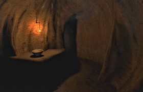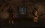 ストーンサークルの石版の順番通りに押し下げると、正面にある装置が動き出し、せり出してきた台の上には接続書があります。さっそく書を開いて、映像が映っている場所へ手を触れてみると、着いた先はモエティの時代(Revel)。 しかし周囲には湖が広がり、見渡してみても行ける所はありません。振りかえってみると後方に小部屋があるようです。元の場所に戻ろうと、その小部屋に入ってみると、正面に接続書が見えます。近づこうとすると2人の男が現われ、なにやら険悪な雰囲気。そしていきなり視界が暗くなってしまいます。倒れる前のことを思い出してみると、どうやら吹き矢で刺されてしまったようです。