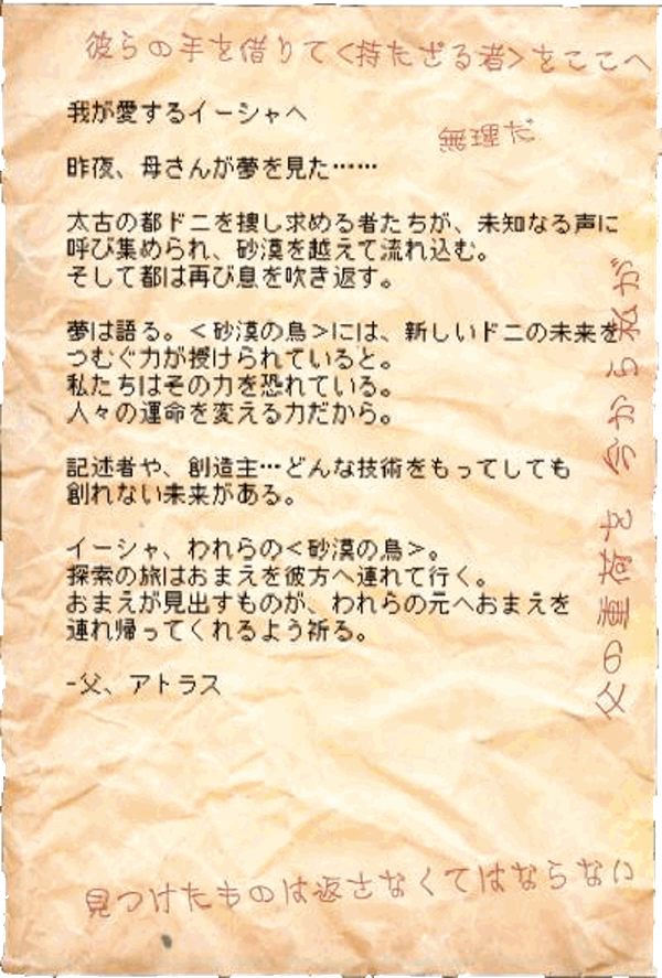 ・・・我が愛するイーシャへ 昨夜、母さんが夢を見た・・・・・・太古の都ドニを探し求める者たちが、未知なる声に・・・