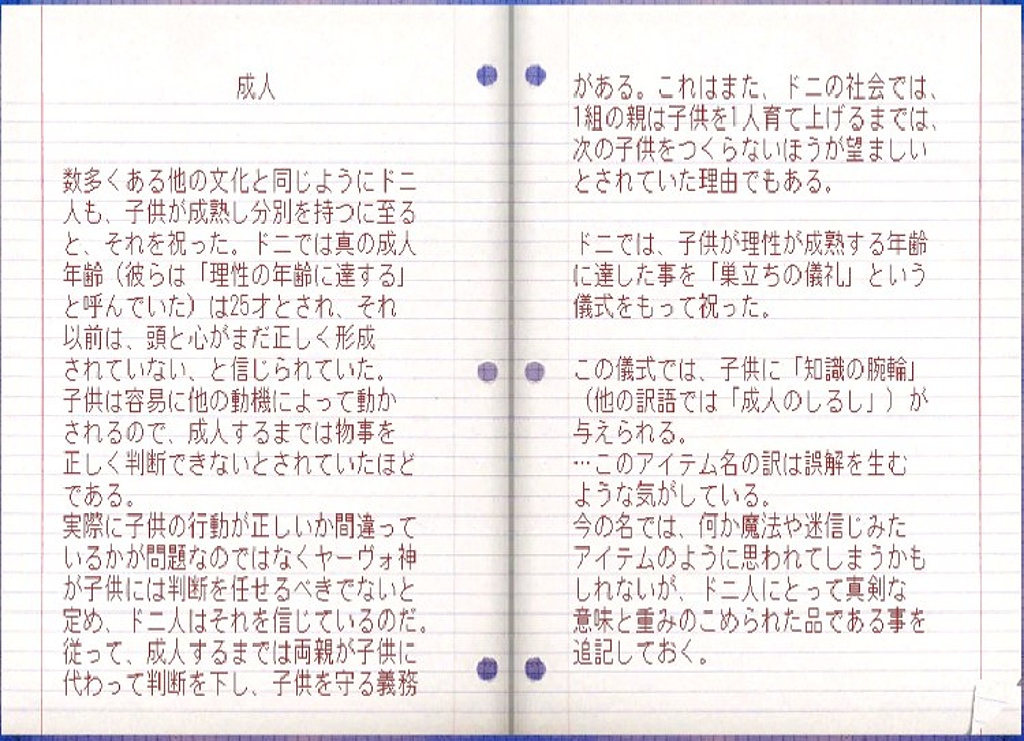 ・・・数多くあるほかの文化と同じようにドニ人も成熟し分別を持つに至ると、それを祝った。ドニでは真の成人年齢・・・