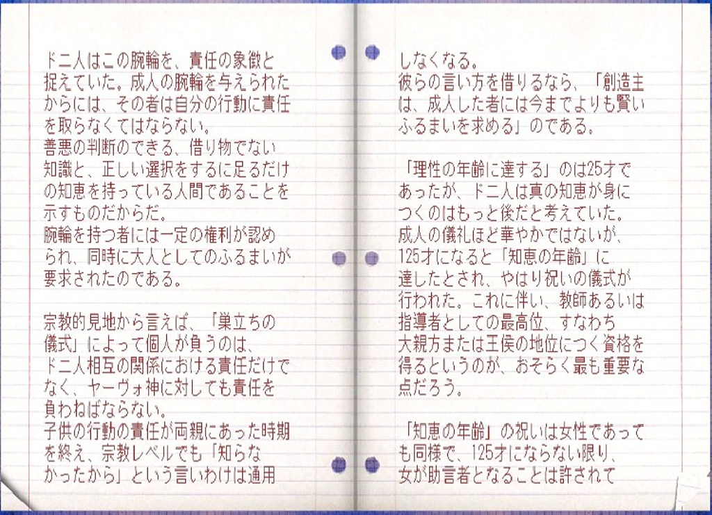 ・・・数多くあるほかの文化と同じようにドニ人も成熟し分別を持つに至ると、それを祝った。ドニでは真の成人年齢・・・