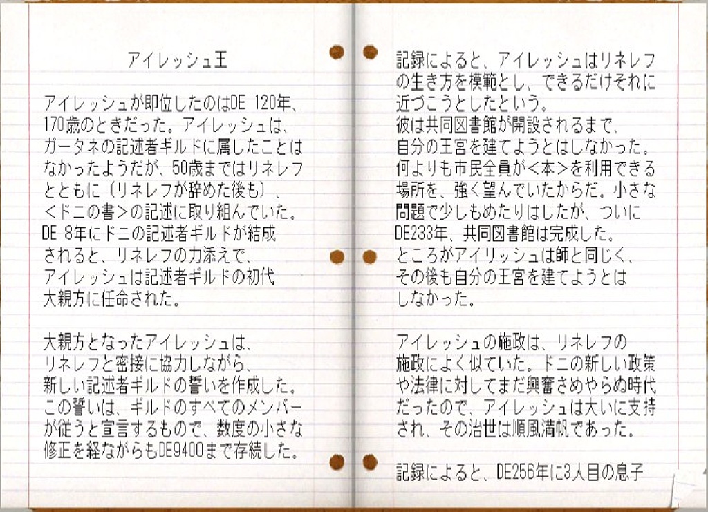 ・・・アイレッシュが即位したのはDE120年、170歳のときだった。アイレッシュは、ガータネの記述者ギルドに属したことは・・・