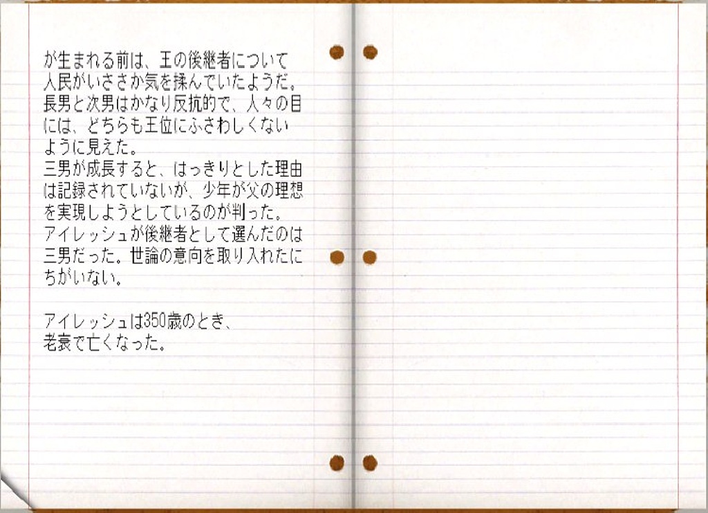 ・・・アイレッシュが即位したのはDE120年、170歳のときだった。アイレッシュは、ガータネの記述者ギルドに属したことは・・・