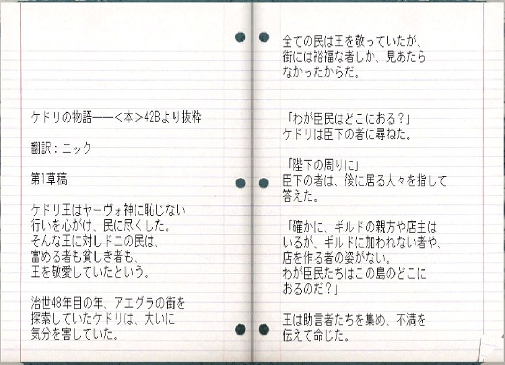 ・・・ケドリ王はヤーヴォ神に恥じない行いを心がけ、民に尽くした。そんな王に対し ドニの民は、富める者も貧しき者も、王を敬愛・・・