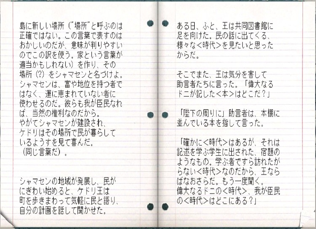 ・・・ケドリ王はヤーヴォ神に恥じない行いを心がけ、民に尽くした。そんな王に対し ドニの民は、富める者も貧しき者も、王を敬愛・・・
