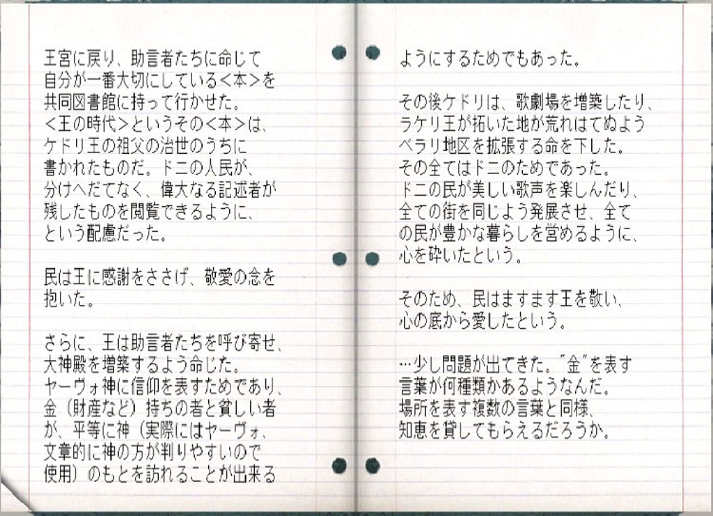 ・・・ケドリ王はヤーヴォ神に恥じない行いを心がけ、民に尽くした。そんな王に対し ドニの民は、富める者も貧しき者も、王を敬愛・・・