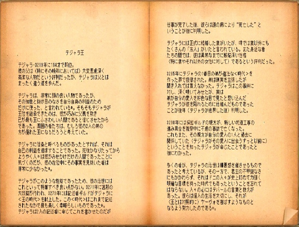 ・・・テジャラ - 3219年に114才で即位。彼の父は(特にその晩年においては)大変思慮深く高潔な人物だという評判だったが、・・・