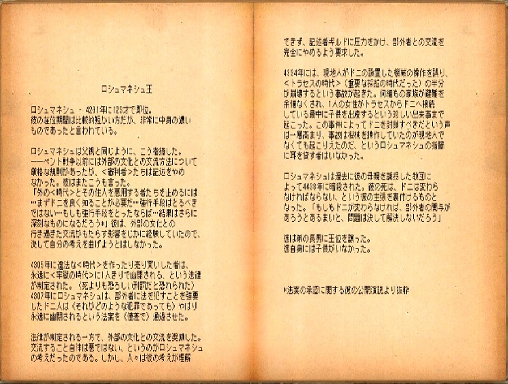 ・・・ロシュマネシュ - 4291年に123才で即位。彼の在位期間は比較的短い方だが、非常に中身の濃いものであったと言われている。・・・