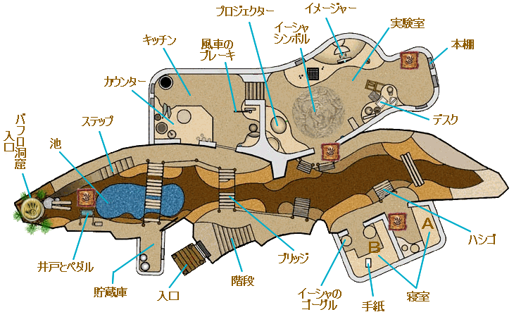 落ちた場所の右側に進むと、すでに落ちている通路があります。その通路ははしごにもなるのです。早速そのハシゴを登って寝室Aに向かって下さい。