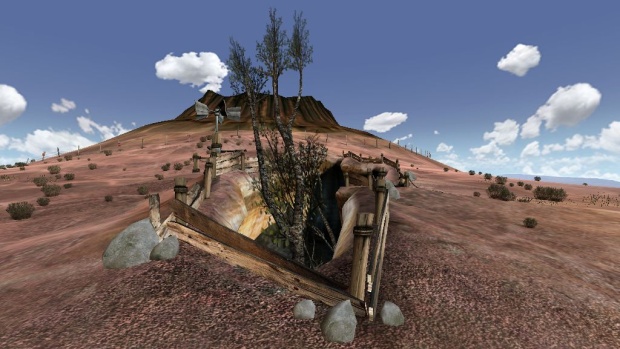 (寝室Aから実験室に行き、そこからさらに下に飛び降りる。そのまま裂け目の底を木に向かって歩いていく。桶を見上げるとタペストリーが見える。ペダルを探す) ≪地表→裂け目→バフロのドア≫
