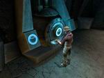 エントランスを出て隣の待合室に行くと左側に「KIを装着してください」と書かれたボードがありますが、「KI」が見当たりません。その先にある出口を右へ進み、開いてる扉を抜け進むと右手にロッカールームがあります。ロッカールームに入って右に進むと先ほどの待合室が見えます。左側に進み部屋の奥まで行くと青く光る装置があります。これが「KI Dispenser(KI自動配布機器)」です。装置の青く光っている所をクリックすると、「KI」が装着されます。まるで腕時計のような携帯式の機器、これが「KI」なのです。カメラとしても使えます。
